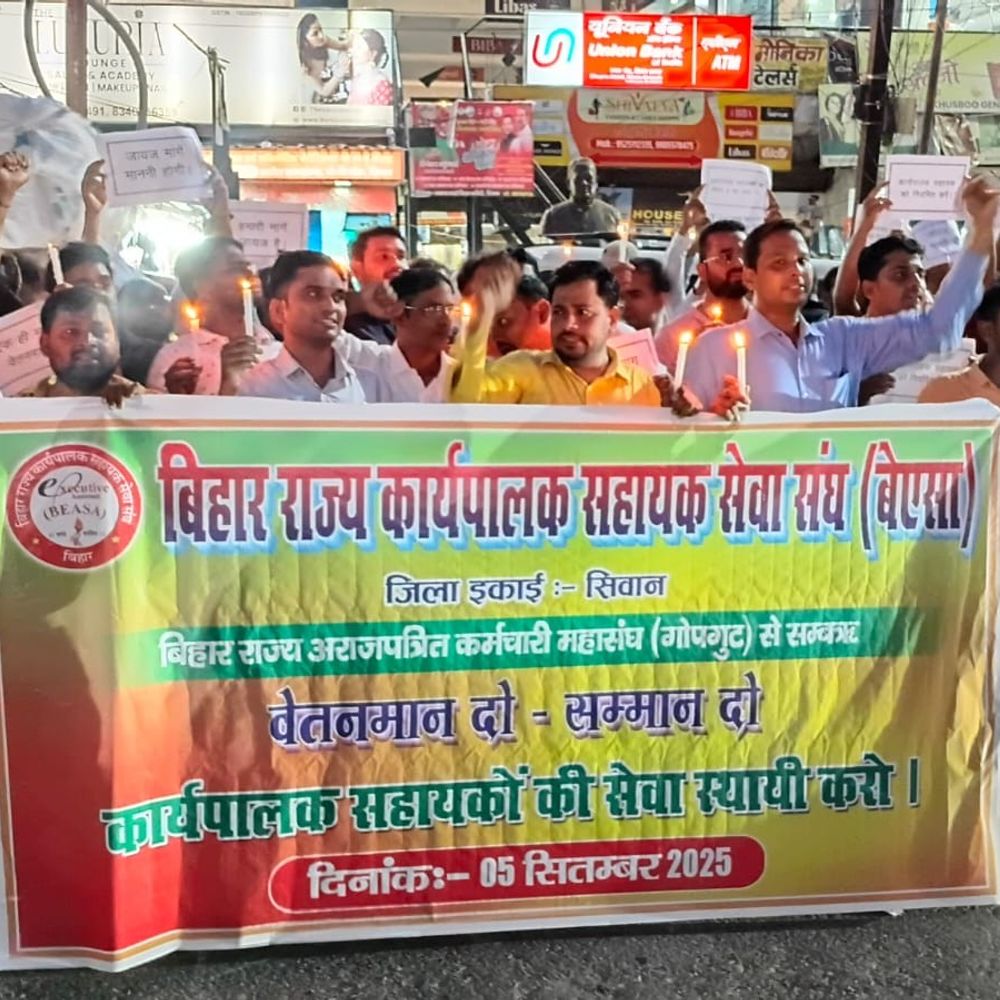 सीवान के गोपालगंज मोड़ से जेपी चौक तक कार्यपालक सहायकों ने शुक्रवार को कैंडल मार्च निकाला। ग्यारह सूत्री मांगों को लेकर कार्यपालक सहायकों का आंदोलन लगातार जारी है। कई बार अपील के बाद भी समाधान नहीं इस मार्च में जिले के सभी कार्यपालक सहायकों ने हिस्सा लिया। मार्च से पहले सभी ने काला बिल्ला लगाकर विरोध किया । उनका कहना कि, सरकार से लंबे समय से अपील की जा रही है, लेकिन अब तक कोई समाधान नहीं हुआ। ऐसे में कैंडल मार्च के जरिए सरकार तक संदेश पहुंचाया गया। समस्याओं की अनदेखी बर्दाश्त नहीं इस पर जिला सचिव ने कहा कि, कार्यपालक सहायकों की समस्याओं की अनदेखी बर्दाश्त नहीं की जाएगी। उन्होंने स्पष्ट किया कि, सरकार जल्द उनकी मांगों पर ध्यान नहीं दिया तो आंदोलन और तेज होगा। वहीं, जिला अध्यक्ष ने कहा कि ग्यारह सूत्री मांगें पूरी तरह जायज हैं और सरकार को इन्हें गंभीरता से लेना चाहिए। कैंडल मार्च शांतिपूर्ण रहा। इसमें शामिल कार्यपालक सहायकों ने कहा कि, उन्हें उम्मीद है कि सरकार जल्द ही उनकी समस्याओं का समाधान करेगी। आकस्मिक निधन पर 40 लाख रुपये मिले मुआवजा कार्यपालक सहायकों की मांगों में सेवा संवर्ग का गठन कर स्थायीकरण करते हुए राज्यकर्मी का दर्जा देने, वेतनमान उपलब्ध कराने, सातवें वेतन आयोग के अनुरूप लेवल 4 से 6 के बीच मानदेय तय करने, पद की न्यूनतम योग्यता इंटरमीडिएट करने, ईपीएफ का लाभ नियुक्ति की तिथि से लागू करने, हटाए गए सहायकों का समायोजन सामान्य प्रशासन विभाग के निर्देश के आलोक में करने और आकस्मिक निधन पर उपादान कम से कम 40 लाख रुपये करने की मांग शामिल है। मार्च के दौरान कार्यपालक सहायकों ने सरकार से अपील की कि उनकी जायज मांगों को शीघ्र पूरा किया जाए, ताकि उन्हें मजबूरन कठोर आंदोलन का रास्ता न अपनाना पड़े।