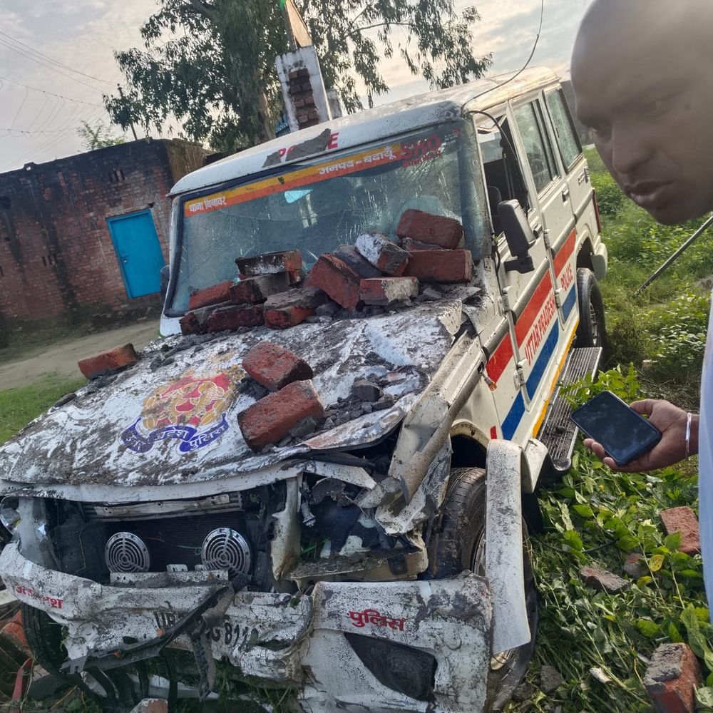 बदायूं में पुलिस की सरकारी जीप पलटी:टायर फटने से हुआ हादसा, एक सिपाही घायल; दरोगा और चालक बाल-बाल बचे