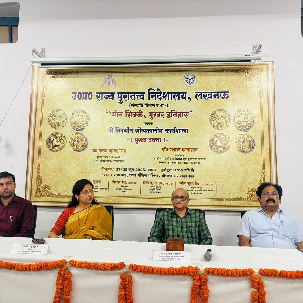 उत्तर प्रदेश राज्य पुरातत्व निदेशालय, छत्तर मंजिल परिसर, कैसरबाग में ‘मौन सिक्के, मुखर इतिहास’ विषय पर दो दिवसीय ग्रीष्मकालीन कार्यशाला का आयोजन किया गया। कार्यशाला का शुभारंभ दीप प्रज्वलन से हुआ। लखनऊ विश्वविद्यालय के पूर्व विभागाध्यक्ष प्रो. प्रशांत श्रीवास्तव मुख्य वक्ता रहे। कार्यक्रम में निदेशक रेनू द्विवेदी, मुद्राशास्त्र अधिकारी डॉ. विनय कुमार सिंह और उत्खनन अधिकारी राम विनय उपस्थित थे।प्रो. श्रीवास्तव ने भारत की प्राचीन मुद्राओं पर व्याख्यान दिया। उन्होंने सिक्कों के स्वरूप और निर्माण प्रक्रिया की जानकारी दी। सिक्कों की ऐतिहासिक महत्ता पर विशेष चर्चा हुई कार्यक्रम में पीपीटी प्रस्तुति के माध्यम से आहत सिक्कों से लेकर गुप्त और उत्तरगुप्त काल तक के सिक्कों का इतिहास समझाया।कार्यशाला में उत्तर मौर्य काल, शक-पहलव, ईरानी और कुषाण काल के सिक्कों की ऐतिहासिक महत्ता पर विशेष चर्चा हुई। लखनऊ और आसपास के जिलों से 150 से अधिक छात्र-छात्राएं शामिल हुए। डॉ. मनोज कुमार यादव ने कार्यक्रम का संचालन किया। ज्ञानेन्द्र कुमार रस्तोगी ने धन्यवाद ज्ञापन प्रस्तुत किया। कार्यक्रम में पुरातत्व निदेशालय के कई अन्य अधिकारी और कर्मचारी भी मौजूद रहे।